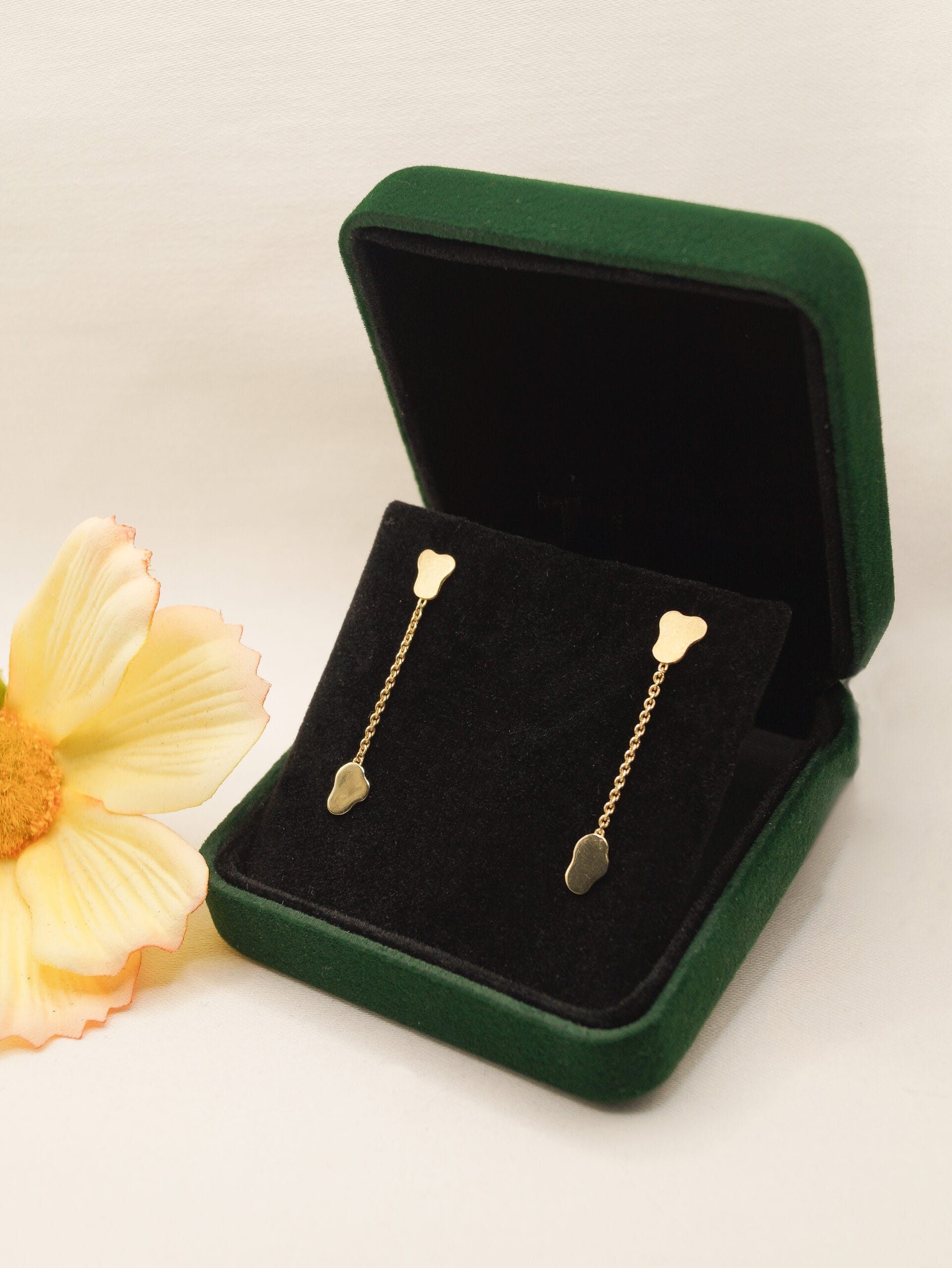 Vergulde oorbellen (925 Sterling zilver met 18kt. goudlaag) met gematteerde en hoogglans organische vormpjes. De oorbellen zijn ongeveer 35mm lang.